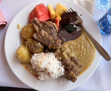 The challenge with local cuisine is that if consists mainly of starches – potatoes, sweet potatoes, rice, cassava, beans, chapati, matoke (steamed mashed bananas), plantains, posha/Ugali (semi-hard cornmeal porridge), along with overcooked veggies (cauliflower, carrots, beans, peppers, onions) and stringy meat. Depending on who you talk to, meat preferences are goat, chicken, beef (in that order) or pork, chicken and goat. If dessert is served – its pineapple and watermelon – always the bright spot of the meal.