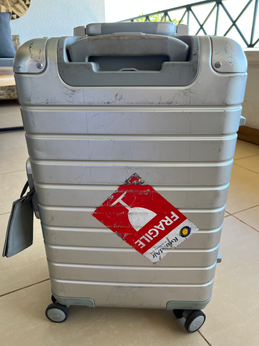 Scott's only suitcase. COVID careful travelers in Doha, Qatar. Flip Flop.
